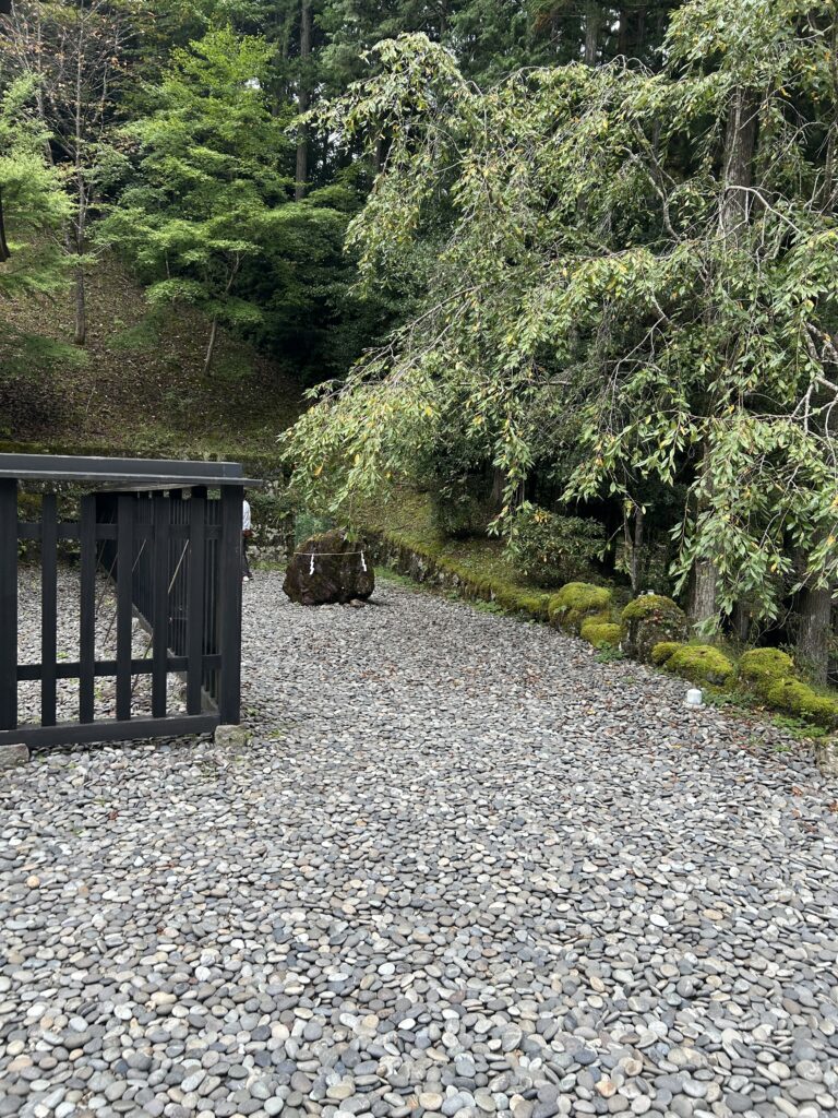 境内から少し歩いたところに禊殿がありますが、そのあたりから川をのぞみます。川の向こうに六角形の岩があり、エネルギーを感じる場所です。